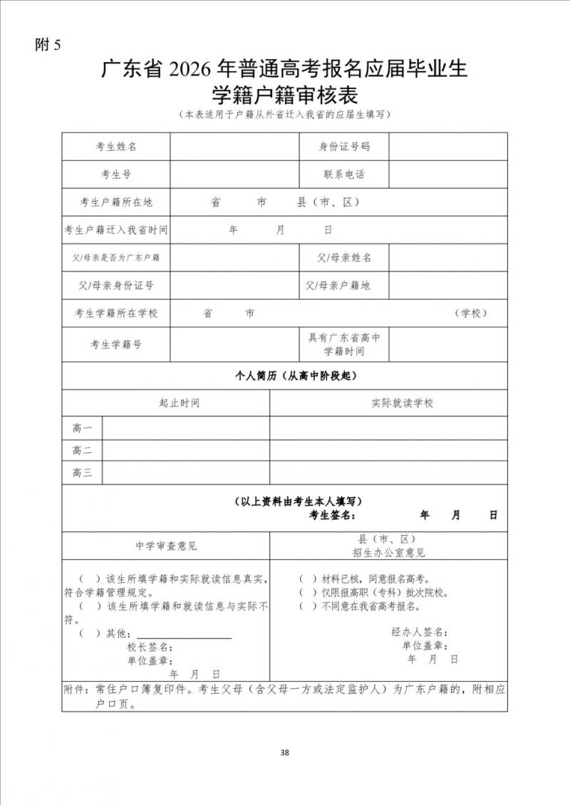 5.广东省2026年普通高考报名应届毕业生学籍户籍审核表(户籍从外省迁入我省的应届生填写)