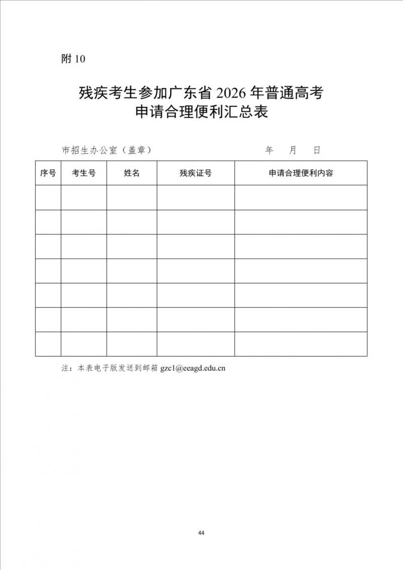 3.结果告知。各市汇总所有考生申请表和评估表,填写《残疾考生参加广东省2026年普通高考申请合理便利汇总表》(见附10),于2025年11月25日前上报省教育考试院(考试招生一处)。省教育考试院将联合省残联、医疗专家进行复核,最终审核结果由省教育考试院发文通知。