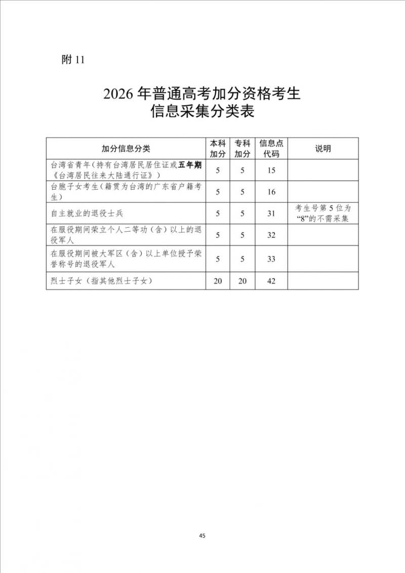 在《2026年普通高考加分资格考生信息采集分类表》(见附11)、《2026年普通高考同等条件下优先录取资格考生信息采集分类表》(见附12)中,凡信息点代码栏未注明“不需采集”的加分资格和优先录取资格类型,均须在普通高考报名时申报。