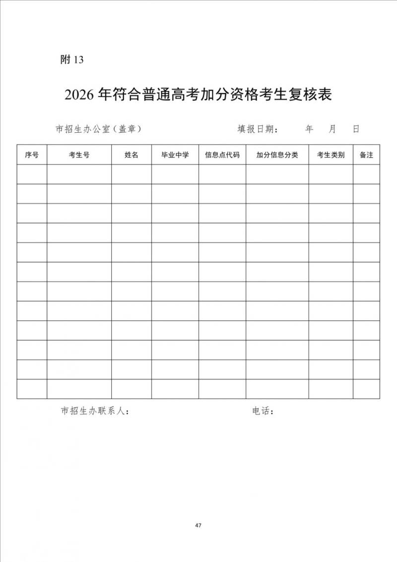 2.复核。各市招生办录入完成后在网上打印出《2026年符合普通高考加分资格考生复核表》(见附13)、《2026年符合普通高考同等条件下优先录取条件资格考生备案表》(见附14),并按附13、14表中名单顺序分别整理申请加分资格、优先录取资格的考生证明材料复印件(每份复印件上须标注“此件与原件一致”字样,签署核准人姓名和日期)。附13表加盖公章后连同相关考生证明材料复印件于11月29日前报送省招生办复核,附14表及相关考生证明材料复印件由各市招生办核准备案。