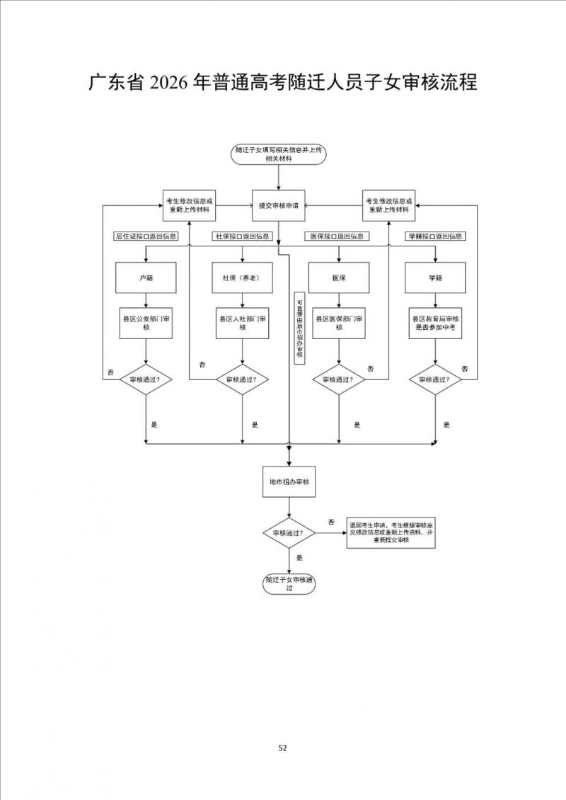 (一)户籍从外省迁入我省的考生户籍从外省迁入我省的考生,高考报名前,应届毕业生须提前办理《广东省2026年普通高考报名应届毕业生学籍户籍审核表》(见附5,简称《学籍户籍审核表》);往届毕业生须提前办理《广东省2026年普通高考报名往届毕业生报名资格审核表》(见附6,简称《报名资格审核表》)。《学籍户籍审核表》和《报名资格审核表》经县(市、区)招生考试机构审核,签署意见为“材料已核,同意报名高考”的,才能在我省正常报考,并填报本专科批次院校志愿;签署意见为“仅限报高职院校”的,只能填报高职(专科)批次院校志愿。仅报考高职院校的中职学校毕业生(含五年一贯制、高职三二分段、“3+证书”专科批次、高职自主招生)无需填写《学籍户籍审核表》和《报名资格审核表》。《学籍户籍审核表》和《报名资格审核表》办理流程如下: