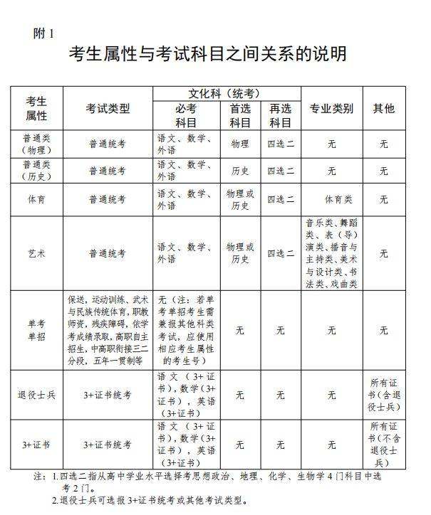 高考报名前,各地招生考试机构须提前在高考报名系统中审定辖区内各高中阶段学校、报名点代码,并在系统中设定报名点与考生号对应规则。考生属性与考试科目之间关系说明见附1。