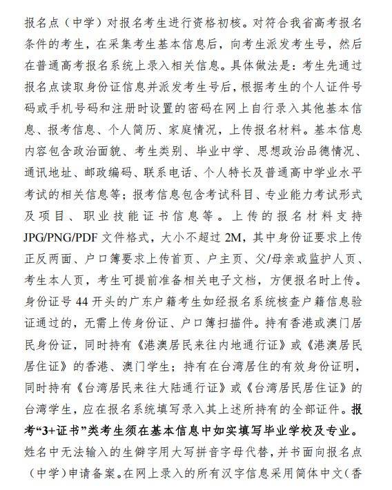 3.网上报名。凭个人证件号码或注册时填报的手机号码和注册时设置的密码登录广东省普通高考报名系统进行网上报名。网上报名时,考生须认真阅读报考须知,签订《考生诚信考试承诺8书》(见附3),并按系统指引,录入本人的基本信息(含普通高中学业水平考试选择考科目在内的报考信息、联系方式、个人简历、家庭情况等),上传身份证、户口簿等身份证明材料(其中身份证号44 开头的广东户籍考生如经报名系统核查户籍信息验证通过的,无需上传),采集考生相片,并缴纳报考费。上传的报名材料支持 JPG/PNG/PDF文件格式,大小不超过2M,其中身份证要求上传正反两面、户口簿要求上传首页、户主页、父/母亲或监护人页、考生本人页,考生可提前准备好电子文档,方便报名时上传。