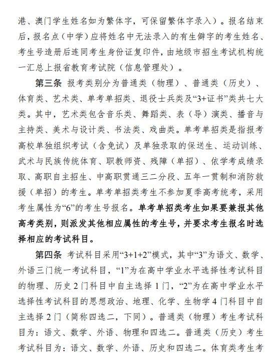 我省高考考生号采用 10位编制,其中第一、二位为地市码;第三、四位为县区码;第五位为考生属性码,“1”代表普通类(物理),“2”代表普通类(历史),“3”代表体育类,“4”代表艺术类,“6”代表单考单招类,“8”代表“退役士兵”类,“9”代表“3+证书”类;第六至十位为流水号,其中第六位为“9”的是随迁子女考生。每个考生只能有一个高考考生号。保送、运动训练、武术与民族传统体育、职教师资、残障(单9招)、高职自主招生、高职三二分段、依学考成绩录取、五年一贯制、消防救援(单招)属于单考单招类型,不参加夏季高考统考,采用考生属性为“6”的考生号报名。单考单招类考生如需参加统考或兼报其他科类考试,应使用相应属性的考生号报名。