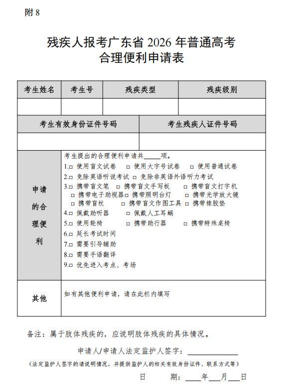 1.考生申请。残疾人考生凭本人身份证、二代残疾人证,填写《残疾人报考广东省 2026年普通高考合理便利申请表》(见附8)在高考报名时向报名点提出正式的申请,并按当地安排,由专家组进行现场确认和评估。无残疾人证考生不能申请合理便利。肢体残疾申请延长考试时间的考生,应在申请表中说明考生肢体残疾的具体情况,是否影响书写,必要时可附医院诊断报告。