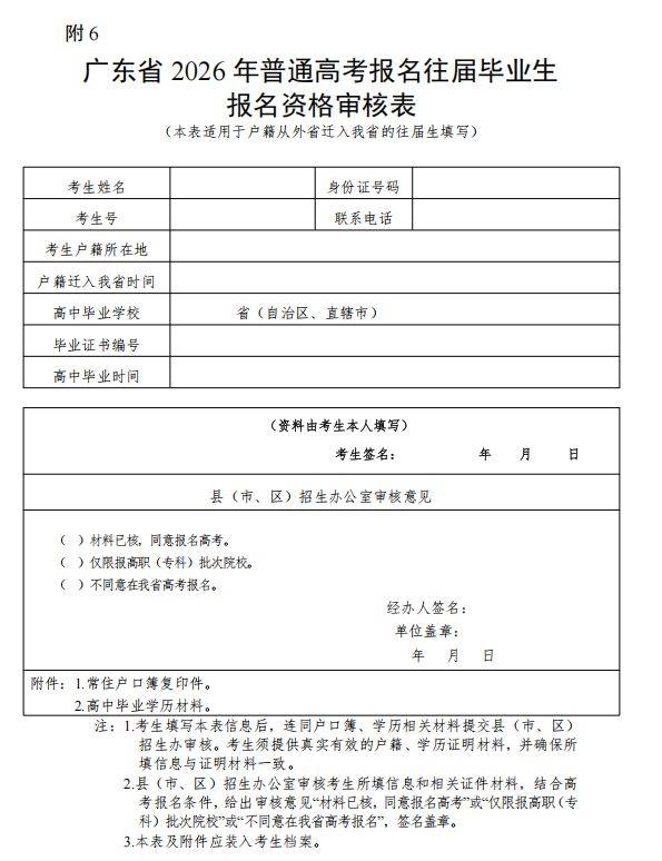 往届毕业生须提前办理《广东省 2026年普通高考报名往届毕业生报名资格审核表》(见附6,简称《报名资格审核表》)。《学籍户籍审核表》和《报名资格审核表》经县(市、区)招生考试机构审核,签署意见为“材料已核,同意报名高考”的,才能在我省正常报考,并填报本专科批次院校志愿;签署意见为“仅限报高职院校”的,只能填报高职(专科)批次院校志愿。仅报考高职院校的中职学校毕业生(含五年一贯制、高职三二分段、“3+证书”专科批次、高职自主招生)无需填写《学籍户籍审核表》和《报名资格审核表》。