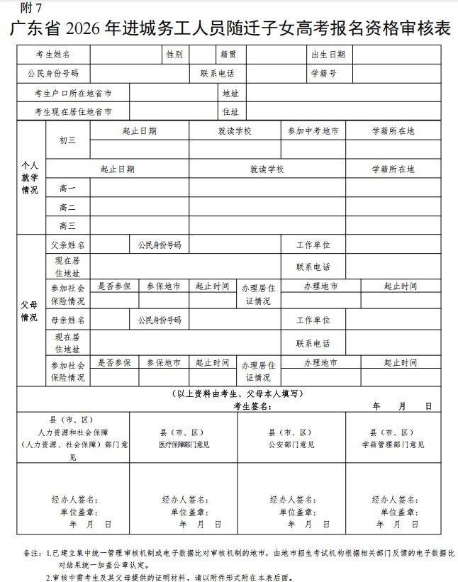 (一)户籍从外省迁入我省的考生户籍从外省迁入我省的考生,高考报名前,应届毕业生须提前办理《广东省 2026年普通高考报名应届毕业生学籍户籍审核表》(见附 5,简称《学籍户籍审核表》);