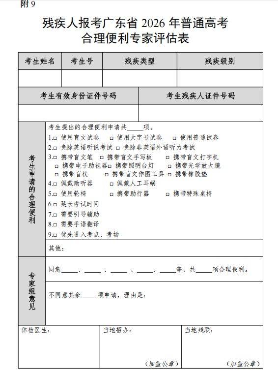 2.市县审核评估。市县招生考试机构联合残联、卫生等相关部门专业人员组成专家组,对考生的申请材料和残疾情况进行现场评估,形成《残疾人报考广东省 2026年普通高考合理便利专家评估表》(见附 9)。