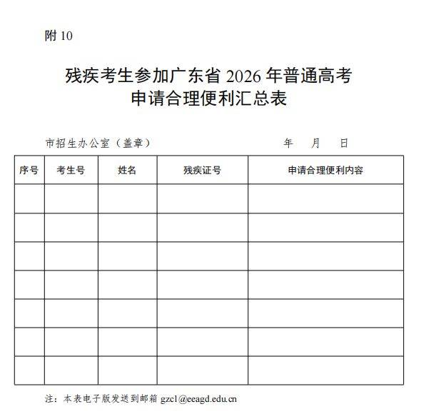 3.结果告知。各市汇总所有考生申请表和评估表,填写《残疾考生参加广东省 2026年普通高考申请合理便利汇总表》(见附10),于2025年11月25日前上报省教育考试院(考试招生一处)。省教育考试院将联合省残联、医疗专家进行复核,最终审核结果由省教育考试院发文通知。