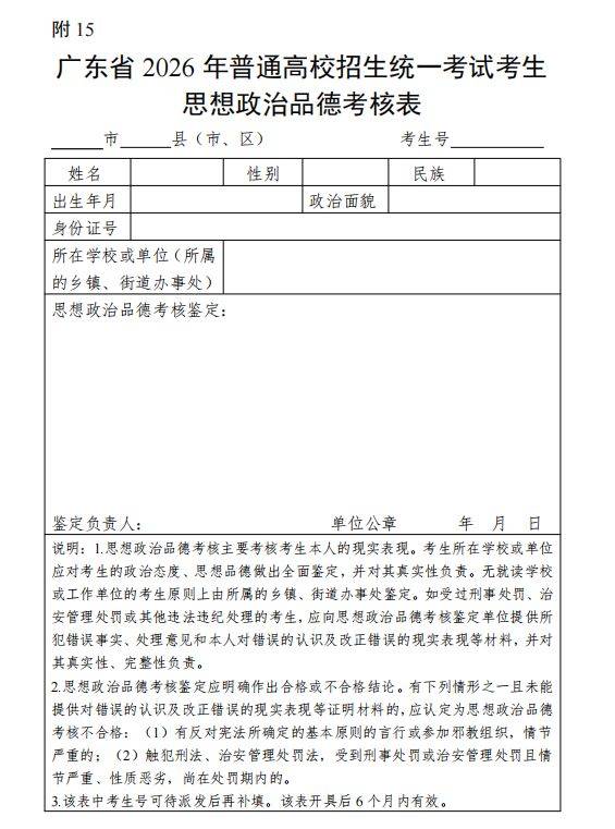 (三)考生应在网上报名时如实填写本人思想政治品德情况。省内高中应届毕业生可使用《广东省中学生德育考核表》作为思想政治品德考核鉴定材料。除使用《广东省中学生德育考核表》作为思想政治品德考核鉴定材料的考生外,其他考生应在高考报名前向所在学校或单位(所属的乡镇、街道办事处)申请办理《广东省2026 年普通高校招生统一考试考生思想政治品德考核表》(见附 15),并在现场确认时交报名点。
