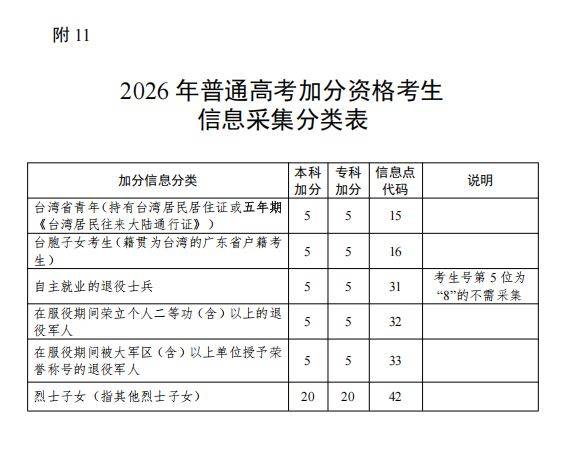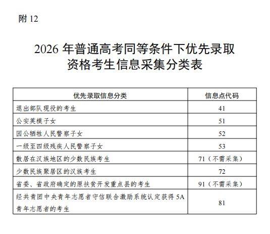 在《2026 年普通高考加分资格考生信息采集分类表》(见附 11)、《2026 年普通高考同等条件下优先录取资格考生信息采集分类表》(见附12)中,凡信息点代码栏未注明“不需采集”的加分资格和优先录取资格类型,均须在普通高考报名时申报。