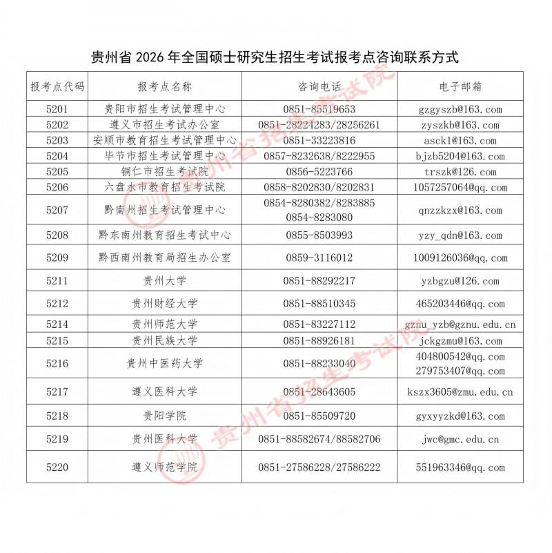 七、贵州省2026年全国硕士研究生招生考试报考点咨询联系方式