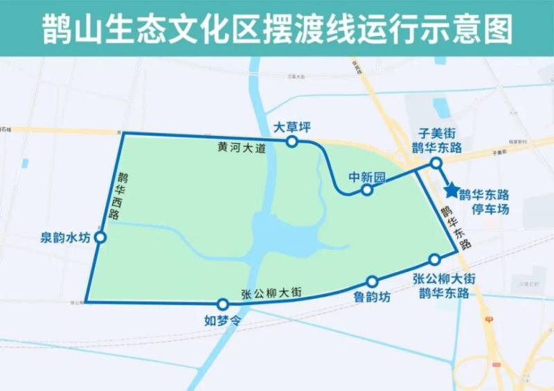 鹊山生态文化区摆渡线沿园区周边道路双向运行,沿途设置鹊华东路停车场、子美街鹊华东路、中新园、大草坪、泉韵水坊、如梦令、鲁韵坊、张公柳大街鹊华东路站点,免费乘坐。
