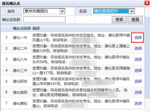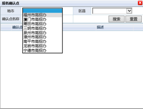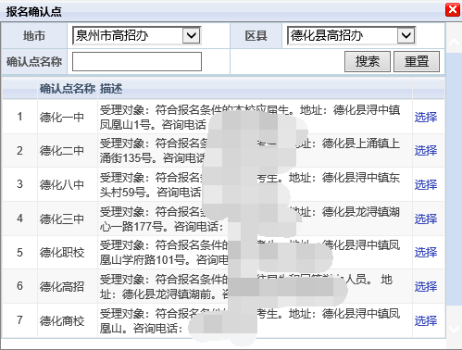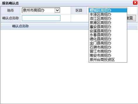 1)选择报名确认点(先选择地市,所在区县,点击搜索按钮,最后选择确认点)