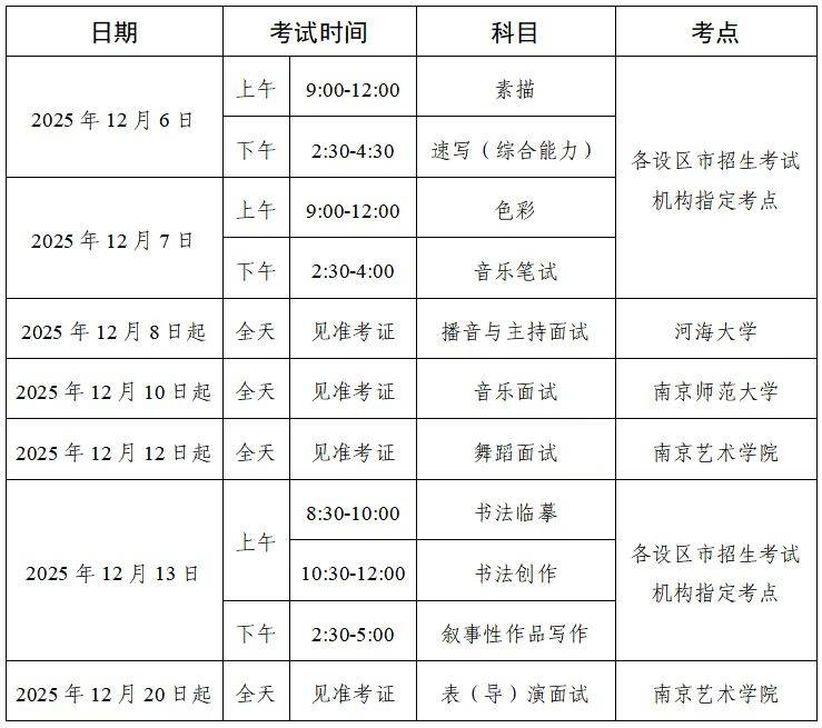 江苏2026年普通高校招生艺术类专业省统考时间及考点安排