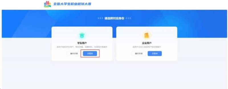1.在全国大学生职业规划大赛(以下简称“职规赛”)官网首页处,点击“报名参赛”或“登录”进入登录页面。