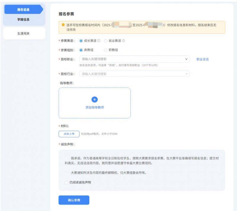 2.填写报名信息时,可选择参赛赛道、参赛组别(就业赛道还需 选择分赛道),按要求完善信息,阅读并勾选“诚信声明”后,点击 “确认参赛”即完成报名。