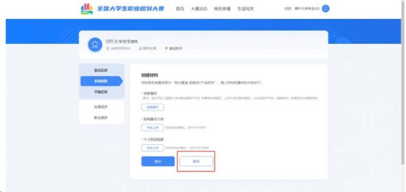 1.若选手成功晋级到省赛,则个人页面会出现“上传省赛材料” 按钮,可进行省赛参赛材料的创建和提交。