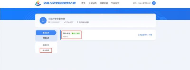 (温馨提醒:就业赛道选手在校级管理员审核通过报名信息后,才能看到“职业测评”模块)