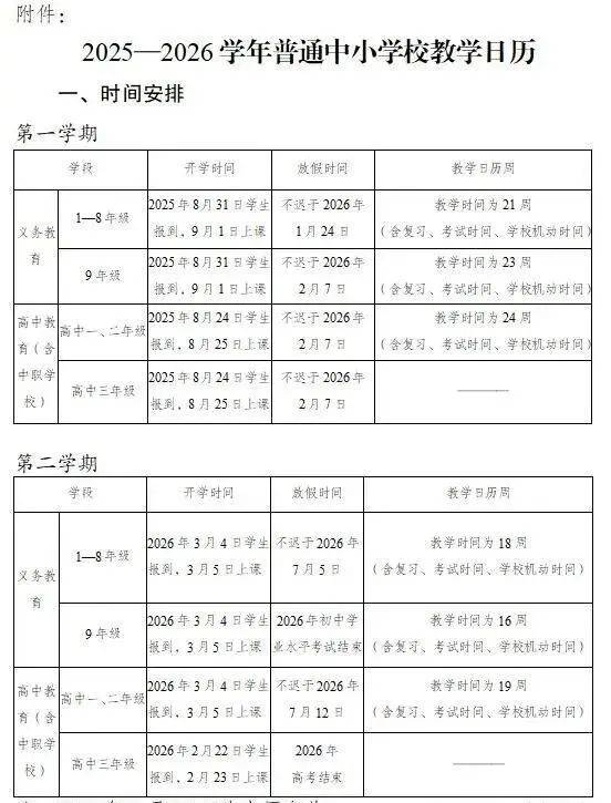 寒假时间不迟于2026年1月24日。1-8年级开学时间为2026年3月4日学生报到,3月5日上课。