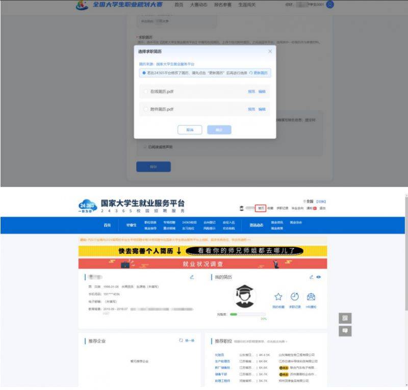 2.就业赛道参赛选手提交参赛材料时,在“求职简历”步骤需前往【国家大学生就业服务平台】完善简历信息,再回到职规赛官网报名系统选择对应的参赛简历。
