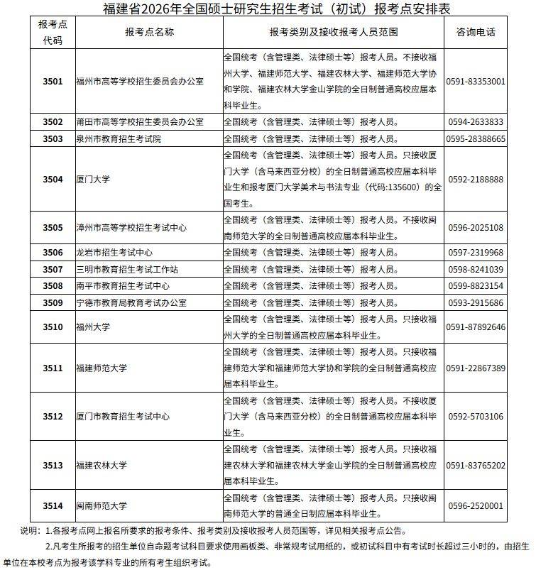 我省报考点全部采用网上确认方式,共设14个报考点,包括福州市高等学校招生委员会办公室、莆田市高等学校招生委员会办公室、泉州市教育招生考试院、厦门大学、漳州市高等学校招生考试中心、龙岩市招生考试中心、三明市教育招生考试工作站、南平市教育招生考试中心、宁德市教育局教育考试办公室、福州大学、福建师范大学、厦门市教育招生考试中心、福建农林大学和闽南师范大学等。考生报考类别详见《福建省2026年全国硕士研究生招生考试(初试)报考点安排表》。