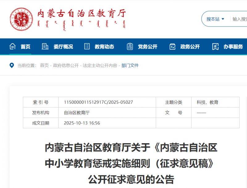 内蒙古自治区教育厅关于《内蒙古自治区中小学教育惩戒实施细则(征求意见稿》公开征求意见的公告