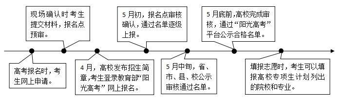 高考报名时,考生须在报名系统中网上申请,并按要求提交相关材料。考生如同时符合国家专项计划、高校专项计划、地方专项计划报考条件,可同时申报。