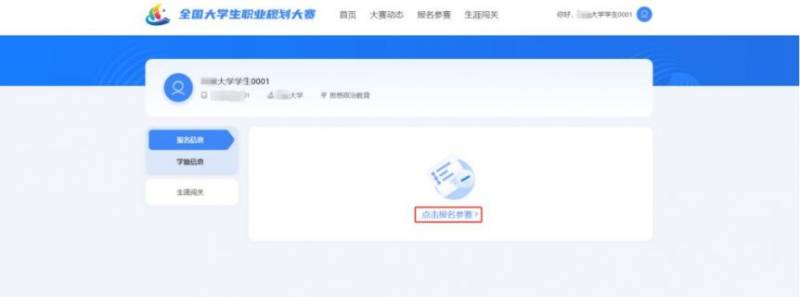 1.登录职规赛官网后,点击页面左侧的“报名信息”进入报名页面,点击“点击报名参赛”按钮填写报名信息。