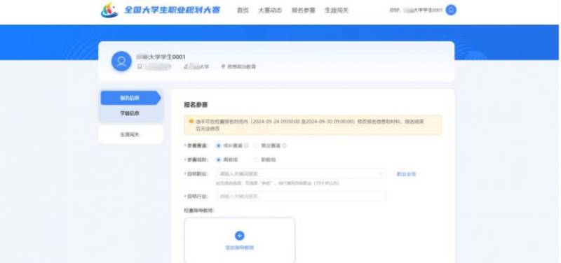 2.填写报名信息时,依次选择参赛的赛道组别,填写本人目标职业、目标行业,上传校赛参赛材料,阅读并勾选“诚信声明”,点击“确认参赛”按钮即可完成报名。