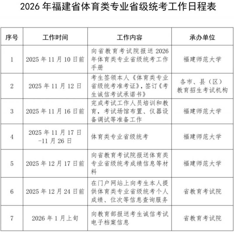 2026年福建省体育类专业省级统考工作日程表