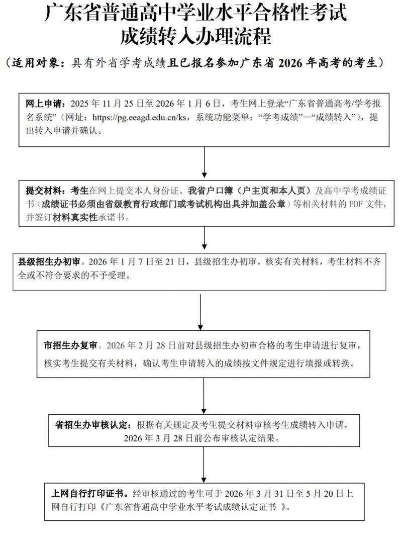 广东省教育考试院根据有关规定网上审核考生成绩转入申请,于2026年3月28日前在网上公布审核结果。考生可进入系统查询审核结果,经审核通过的考生可于3月31日至5月20日自行下载并打印“广东省普通高中学业水平考试成绩认定证书”。逾期系统关闭后将不能下载并打印证书,但不影响已转入成绩在招生录取中的使用。