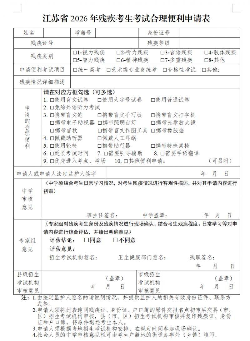 一、残疾考生参加考试,申请合理便利的,须填写《江苏省2026年残疾考生考试合理便利申请表》,并提供本人第二代及以上《中华人民共和国残疾人证》、身份证和户口簿等证明材料的原件,经所在报名点初审,11月10日前交县(市、区)招生考试机构,逾期不予受理。