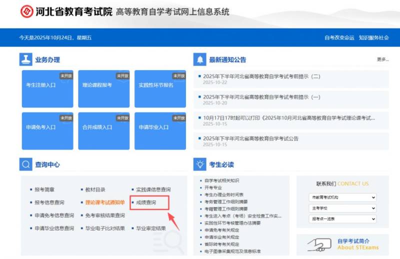 考生可通过河北省教育考试院高等教育自学考试网上信息系统(http://zk.hebeea.edu.cn)查询。考生可登录自考信息系统,进入“首页→查询中心→成绩查询”栏目,查看当次考试成绩或合格成绩。