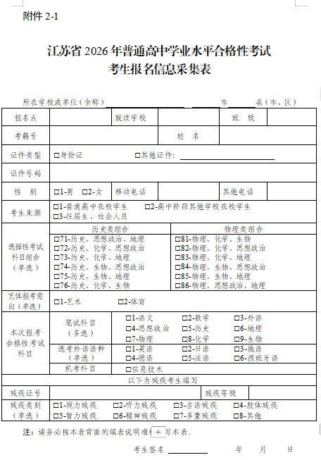 《江苏省2026年普通高中学业水平合格性考试考生报名信息采集表》填表说明