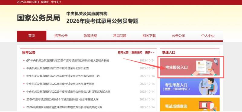 各招录机关的招考人数、具体职位、考试类别、资格条件、咨询电话等详见《中央机关及其直属机构2026年度考试录用公务员招考简章》(以下简称《招考简章》),有关报考政策规定、报名网络技术和考场考务安排等事宜详见《中央机关及其直属机构2026年度考试录用公务员报考指南》(以下简称《报考指南》)。《招考简章》、《报考指南》通过中央机关及其直属机构2026年度考试录用公务员专题网站(以下简称“专题网站”,http://bm.scs.gov.cn/kl2026)公布。