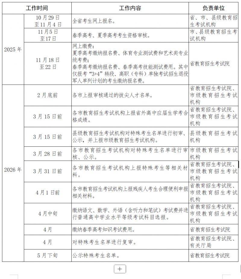 填报信息:2025年10月29日至11月4日(每天9:00—18:00)。报考“3+4”转段考生及“3+4”转段兼报春季高考考生也须在上述时间完成填报。
