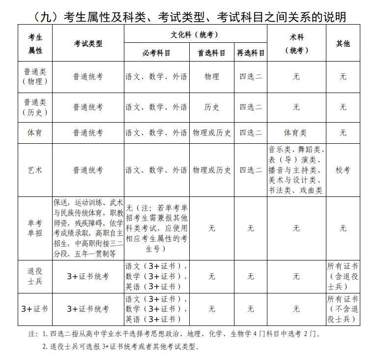 普通类考生根据所选物理或历史,对应参加相应科目考试。体育类、艺术类考生在此基础上,额外参加体育专业考试或艺术专业考试。