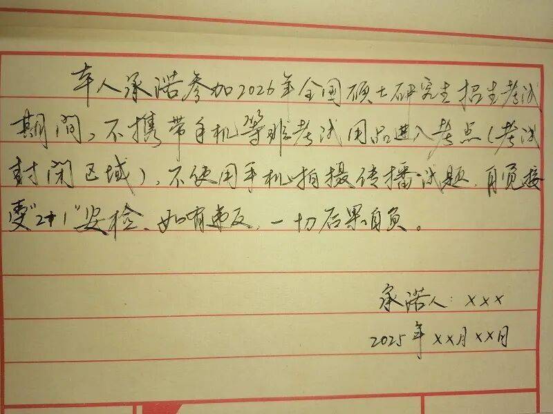 所有考生均须提交由本人手写并签名的《考生不携带手机入场考试承诺书》。书写内容如下:“本人承诺参加2026年全国硕士研究生招生考试期间,不携带手机等非考试用品进入考点(考试封闭区域),不使用手机拍摄传播试题,自觉接受“2+1”安检,如有违反,一切后果自负。承诺人:XXX,2025年XX月XX日”。