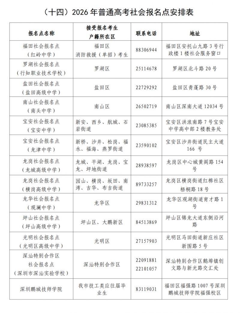 2026年深圳高考社会报名点安排表