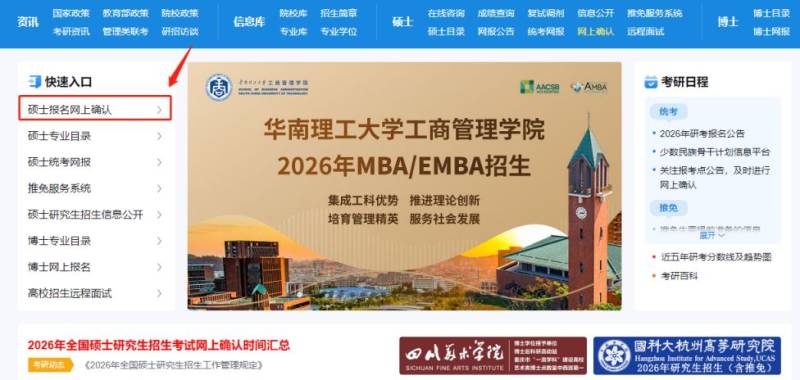 考生应在规定时间内登录“中国研究生招生信息网”(网址:https://yz.chsi.com.cn,简称“研招网”),按省级教育招生考试机构、报考点以及报考招生单位的网报公告要求参加网上确认。逾期不再补办。