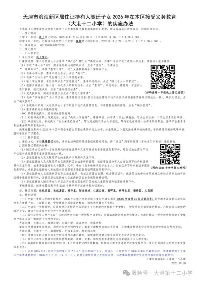 天津市大港十二小学随迁子女2026年申请小学入学转学通知