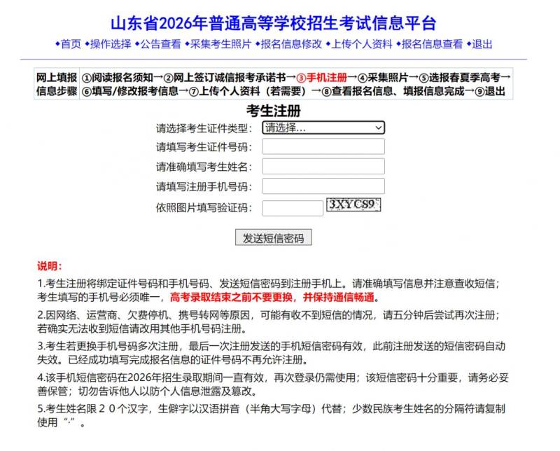 注册个人信息时,考生需选择证件类型,输入证件号码,通过所输入个人手机号码获取手机短信密码后,完成个人信息注册。注册后上传本人照片,考生要严格按照采集操作流程和照片标准上传照片(具体内容见附件2)。考生应认真阅读《考试规则》《国家教育考试违规处理办法》等有关规定,勾选“我承诺诚信报考”签订《考生诚信报考承诺书》。按照报名条件、地点等填报信息项要求,如实完整填写个人信息并提交,完成网上填报信息。修改与填报过程相同。