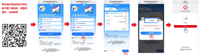 三、缴费方式:报名成功后考生通过微信或支付宝扫描下图二维码后按图例操作完成缴费,或通过“贵州省普通话培训测试中心”微信公众号上的缴费链接缴纳。(注意缴费时间节点)