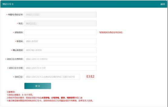 如果考生未绑定口令卡,需要绑定口令卡。考生需要输入动态口令卡序列号、动态口令卡卡密、动态口令,点击【提交】按钮,即可绑定成功。如下图所示:动态口令的坐标为E3:E2,刮开动态口令卡对应位置的格子,输入口令卡上相对应的数字或字母PD67RQ(实际以系统显示坐标对应的动态口令为准)。