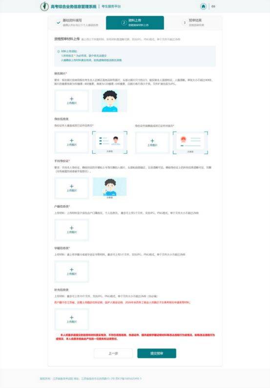 考生填写完基础资料后,需要根据提示上传报名照片、身份证件人像面或其它证件信息页、身份证件国徽面或其它证件封面页、手持身份证、户籍信息类、学籍信息类及补充信息类等照片、勾选个人承诺书,点击【提交预审】, 进入审核结果页面。