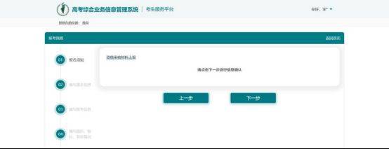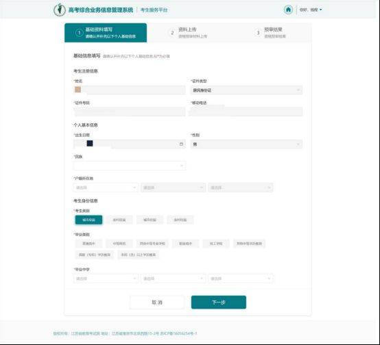 民族、户籍所在地、考生类别、毕业类别、毕业中学等信息。点击【下一步】,进入资料上传页。