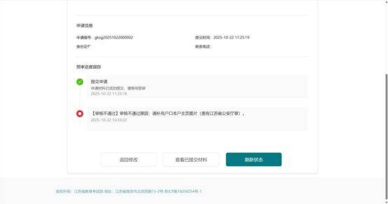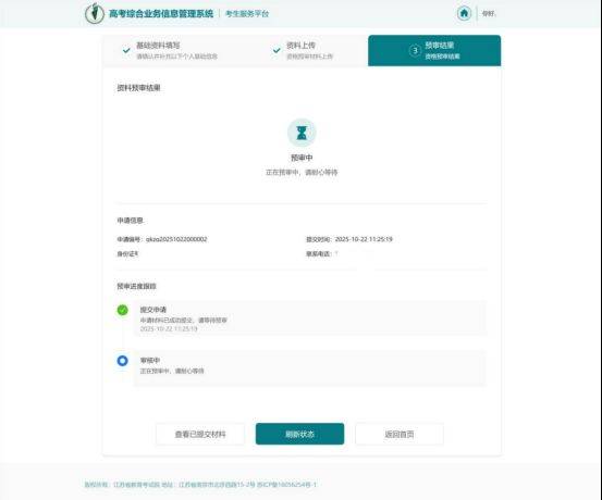 资料提交成功后,进入预审结果页面,能够查看资料预审结果、申请信息、