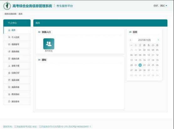 也可以从左侧菜单栏【我的报考】中,找到“江苏省 2026 年普通高校招生考试报名 ”栏目,点击【开始报名】进入报名页面。