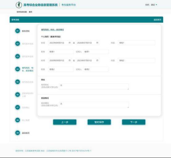 考生需要填写两条个人简历,从最高学历起,按照时间由近到远填写。填写个人简历、特长、奖惩情况,点击【下一步】,进入填写其他信息页面。